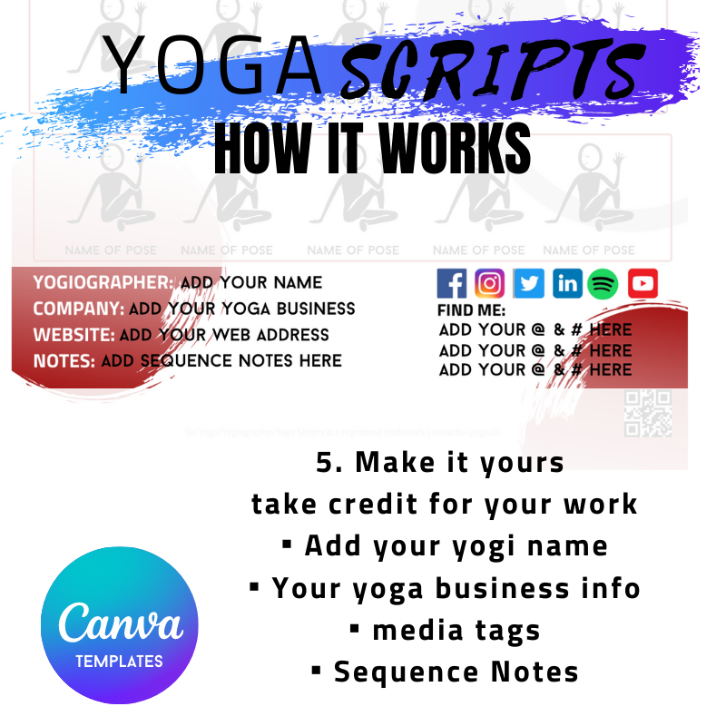 Each script has up to 4 different styles of yoga on it, ranging from the most popular style, to specialist styles, Private & training scripts, all feature a tick box sytem with area to fill in you own details such as business name, websites, media tags, sequence name & more